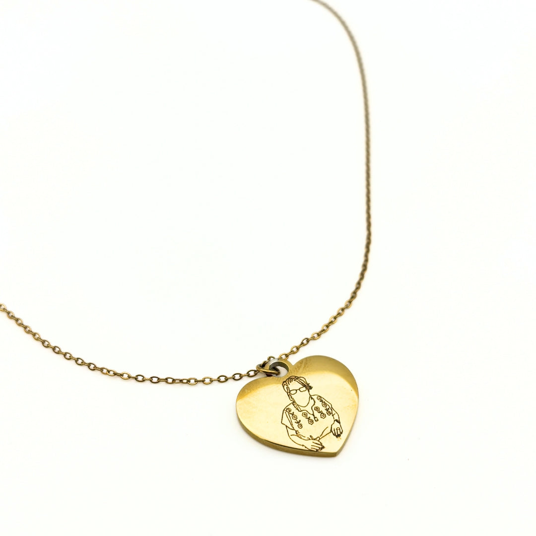 Este collar permite grabar un retrato en la parte frontal del corazón, transformando una fotografía en un recuerdo eterno. En el reverso, puedes añadir un nombre, fecha o frase corta, haciendo de esta pieza algo aún más personal y único.