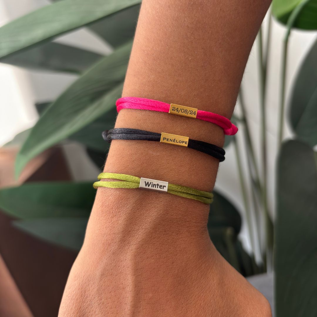 La Pulsera Hilito es ajustable y cuenta con una plaquita rectangular en el centro que puedes personalizar hasta en 4 caras con nombres, fechas, apellidos o palabras especiales. Ideal para regalar o llevar contigo un detalle único y personal.